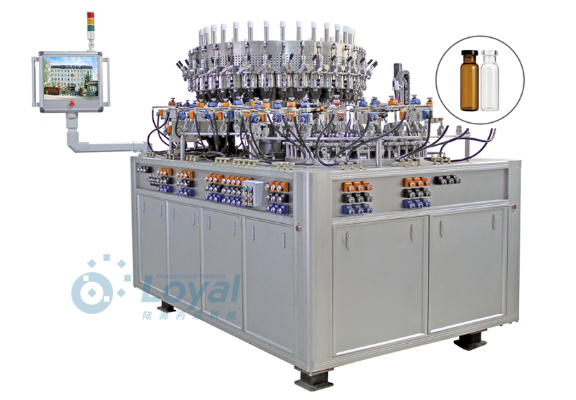西林瓶生產線包括:自動上管、自動成型、經機械手轉換至前端檢測線(也叫生產管控)、檢測線檢測的項目:1、瓶口內外徑 2、瓶身長短 3、瓶身外徑 4、瓶口邊厚 5、瓶底內凹尺寸檢測;經檢測后的合格品再用機械手夾盤轉換至退火爐網帶上,經高溫減除應力后再降溫,通過氣動吸盤將回火后的小瓶轉換至后端檢測線,后端檢測(也是重檢也叫終檢),經后端拍照檢測項目